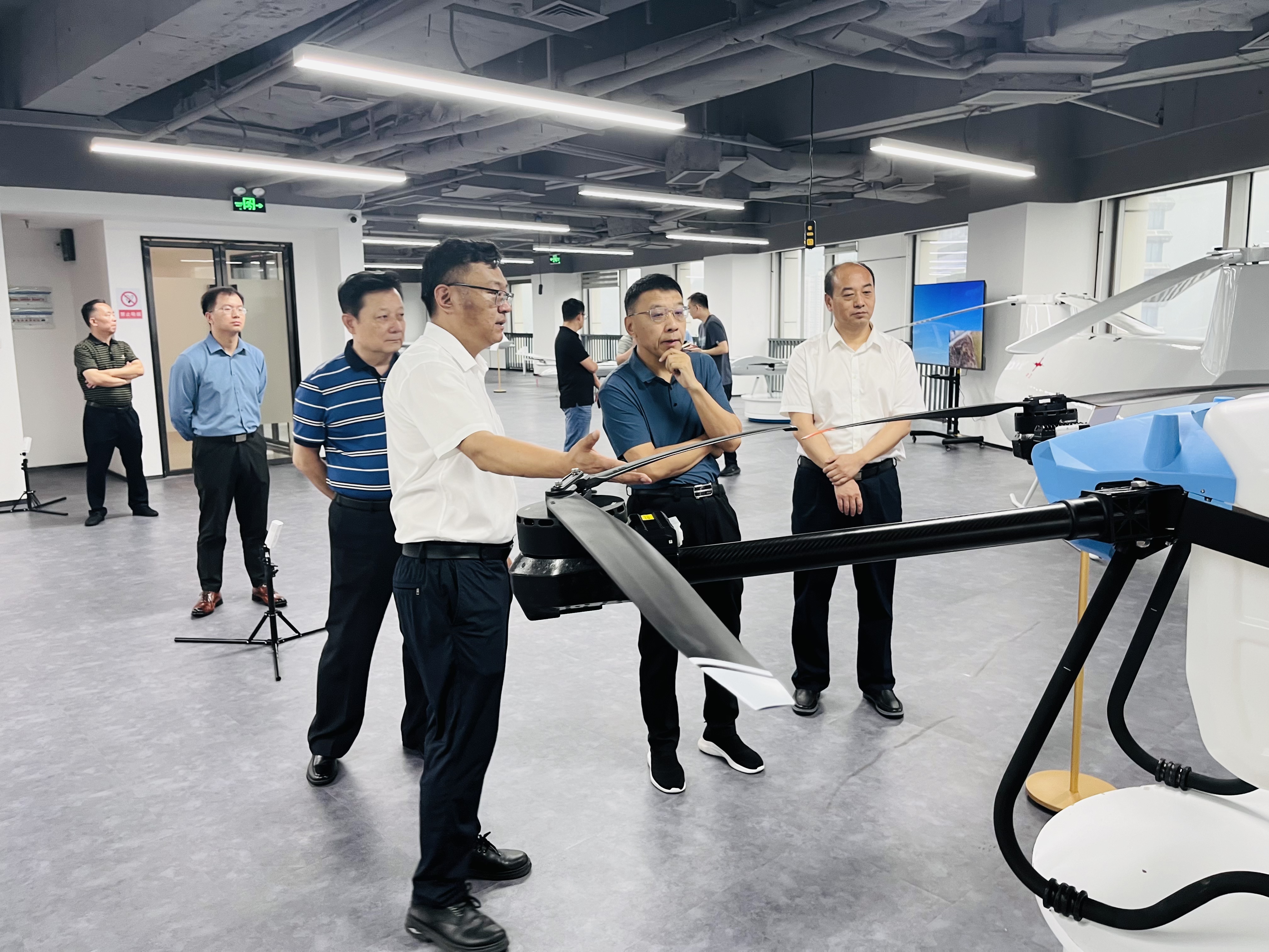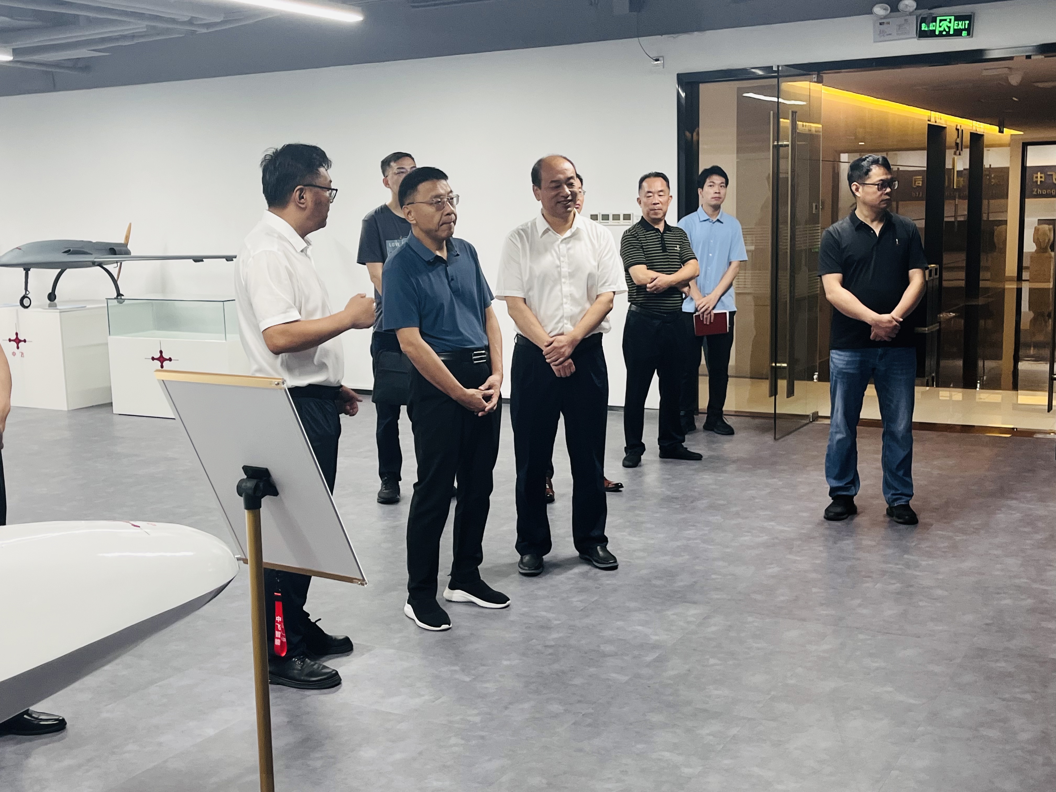 王奕文副书记认真听取汇报,不时驻足观看,对公司自主研发的中小型长航时固定翼无人机、纵列式大载重无人机表现出浓厚兴趣,并详细询问了技术参数、应用场景和市场反馈。
